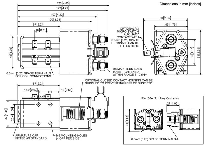 RW180具有单刀单掷,双断口主触点和银合金尖端,这些尖端具有耐焊接性,耐磨损性和优异的导电性。RW180具有M8螺栓主端子和6.3mm的黑色线圈连接。它可以通过M5螺纹孔或安装支架进行安装 - 可以提供安装,也可以单独安装。安装可以是水平或垂直的,垂直时M8接触螺栓应该朝上。如果要求向下定位,我们可以调整接触器来弥补这一点。